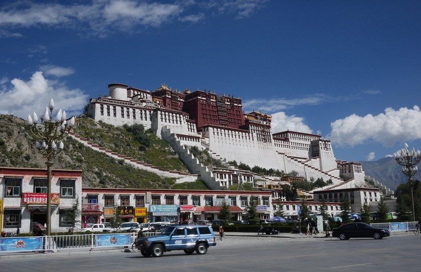 位于拉薩市瑪布日山上,是我國著名的宮堡式建筑群,布達(dá)拉梵文意為觀世音圣地。相傳公元7世紀(jì),土蕃贊普松贊干布與唐聯(lián)姻,為迎娶文成公主,在此建宮室,后世屢有修砌。至17世紀(jì)中葉,達(dá)賴五世受清朝冊封后,又?jǐn)U建重修,歷時500年始具今日規(guī)模,后為歷代達(dá)賴?yán)锏亩瑢m。布達(dá)拉宮分為白宮和紅宮兩部分,全部建筑依山勢修建,群樓高聳,崇閣巍峨,宮體主樓13層,高117米,東西長400米,南北寬350米,全部為石木結(jié)構(gòu),五層宮頂覆蓋金瓦,外觀氣勢雄偉非凡,建筑藝術(shù)別具一格,體現(xiàn)了藏漢文化的融合,是藏族建筑藝術(shù)的精髓.