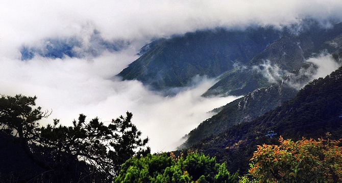 廬山處于亞熱帶季風區(qū),雨量充沛、氣候溫和宜人,盛夏季節(jié)是高懸于長江中下游“熱海中”的“涼島”。廬山的年降水量可達1950—2000毫米,而山下的九江則為1400毫米左右,故山中溫差大,云霧多,千姿百態(tài),變幻無窮。有時山巔高出云層之上,從山下看山上,廬山云天飄渺,時隱時現,宛如仙境;從山上往山下看,腳下則云海茫茫,有如騰云駕霧一般。有時山上暗無天日,山下則是細雨飄飛,情趣異常。