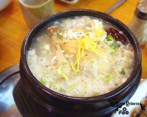 韓國(guó)人喜愛人參雞湯,不止因?yàn)樗拿牢叮€因?yàn)樗哂袪I(yíng)養(yǎng)、滋補(bǔ)、美容等多重功效,可謂多重功效于一身的多功能產(chǎn)品。人參雞湯,其實(shí)就是取整只的童子雞,在雞肚子里放上人參、糯米、紅棗等多種食材,用慢火慢慢燉制而成。吃的時(shí)候,將整雞剪碎,放上海鹽及胡椒。燉的爛爛的雞肉配上雞肚子里早已燉的軟綿綿的糯米~真是軟滑儒香,非常好吃。