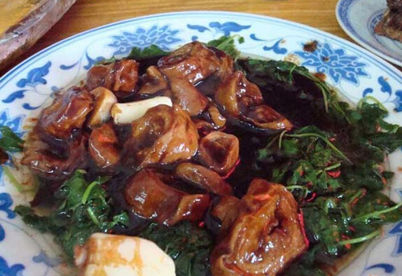 草頭是江浙常見的野菜,圈子,是豬的直腸,‘圈子 ’出油,草頭吸油。當紅燒的圈子遇上生煸的草頭,不僅倚紅偎翠,煞是養(yǎng)眼,而且因草頭“吃油”的天性恰好吸足了圈子的油膩,吃起來草有肉感,肉有草香,肥而不膩。很多當?shù)厣虾2损^里都有這道菜。