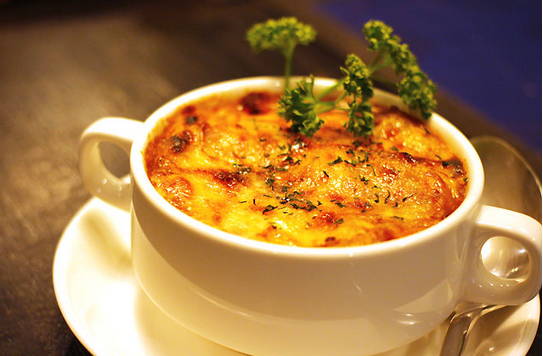 洋蔥湯:從羅馬時代開始風行,可能最能代表法國湯的就是洋蔥湯了,一般作為前菜呈現(xiàn)。湯的表面有一層奶酪形成的殼,內(nèi)部除了切碎后煨過的洋蔥還經(jīng)常有煮軟的面包。