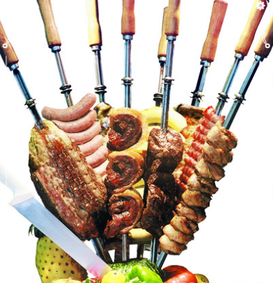 巴西烤肉:巴西的烤肉主要有烤牛肉、雞腿、香腸甚至菠蘿也烤。它是把這些原料腌過后分別穿在一個(gè)長約一米帶凹槽的扁平鐵棍上放在碳火上慢慢燒烤,期間要刷幾次油,烤至兩面金黃、肉香撲鼻的時(shí)候就可以食用了。