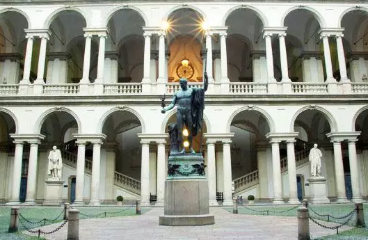 他就是著名的布雷拉畫廊,堪稱文藝復(fù)興的寶殿。整座建筑呈四方形庭院,共兩層,均有柱廊。庭院中是一座拿破侖一世的高大銅像,右手握有勝利的象征,左手拿著權(quán)仗,銅像是由新古典主義大師安·卡諾瓦于1809年鑄成。四周還有許多科學(xué)家、藝術(shù)家的石像。