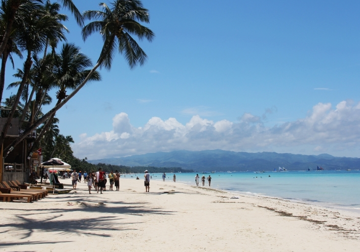 長灘島之美麗,有如它的名字,那是長達(dá)七公里的銀色沙灘。清晨,從小旅館中散步而出,坐在椰子樹下,清涼的海風(fēng)送來陣陣茉莉花香。潮水已在夜色星空下靜悄悄地退去,銀色沙灘露出了寬闊的胸脯,那上面搖曳著修長的椰影,勤勞的清潔工在耙平沙地上的腳印,還有早起的人在撿拾貝殼。