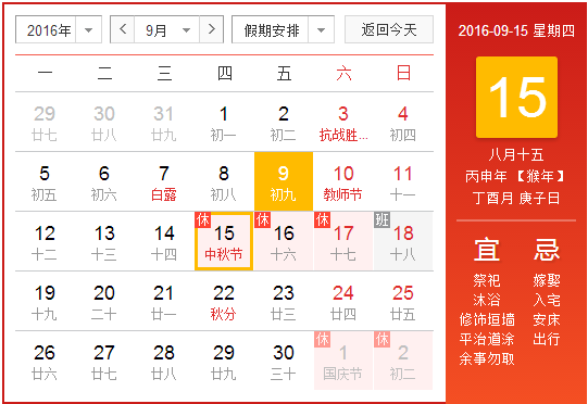 2016年中秋節(jié)假期將至,熱愛旅游的小伙伴們早早就考慮中秋假期改如何安排,利用好這個假期做個完美的旅行,小編先在這里幫大家確定一下中秋節(jié)假期放假安排吧,中秋節(jié):9月15日至9月17日,放假三天。