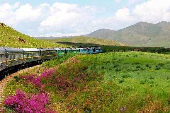 K3次列車在蒙古國境內(nèi)運行時,一路上都是比內(nèi)蒙更加原生態(tài)的大草原,鐵路兩旁不時出現(xiàn)大片的野花,各種顏色都有。