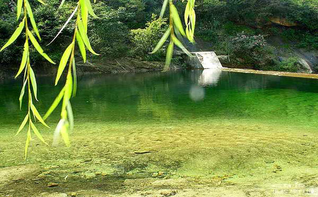 初到飛瀑潭,游人方以為已到了山谷盡頭,誰知“山窮水復(fù)疑無路,柳暗花明又一村”。就在飛瀑潭一側(cè),有一條石雕穿云的登山梯道,巖石上刻有篆書“天梯”二字,沿天梯上行,步步高登,方知山外有山,天外有天,瀑外有瀑,潭外有潭。到了山頂,神潭風(fēng)景區(qū)主要景區(qū),神潭瀑和神潭以其雄奇的姿態(tài)呈現(xiàn)在游人面前。但見神潭瀑由十幾米高處下瀉,匯成方圓30米的神潭,碧綠的潭水清澈見底,游魚可數(shù),一塵不染,景色迷人。