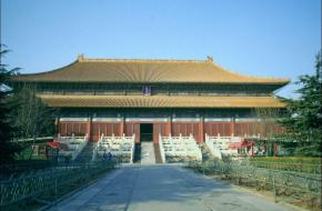 祾恩門兩側(cè)還各有掖門一座,均作隨墻式琉璃花門,門上的斗拱、額枋,門頂?shù)耐唢棥⒋w均為黃綠琉璃件組裝,在紅墻的映襯下格外分明。 院內(nèi),北面正中位置建有高大巍峨的祾恩殿。這座大殿在明清兩代,是用于供奉帝后神牌(牌位)和舉行上陵祭祀活動(dòng)的地方。