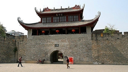 東門城樓始建于清康熙五十四年(1715年),城門上部城樓用古磚砌筑,下部由紫紅砂巖砌成。城樓高11米,大門上方有槍眼8孔,城門上為兩層譙樓,歇山屋頂,覆以腰檐,飛檐翹角,精美壯觀。正殿當中塑關(guān)云長像,1991年新增明城沙盤模型和古炮臺。