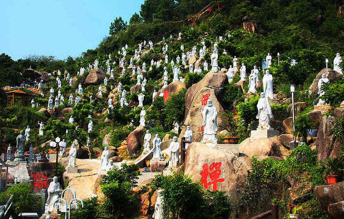 羅漢山為承德名山之一,附近風光綺麗,武烈河水縈繞山腳,山間遍植松樹,其南部尚有兩峰相連,好似兩個小羅漢扶肩耳語;東部有兩峰,一若托缽化緣的老僧,一若侍奉師傅的小沙彌。羅漢山諸峰,猶如群僧聚首,講經(jīng)說法的一組塑像,游人觀之無不贊嘆自然的鬼斧神功。