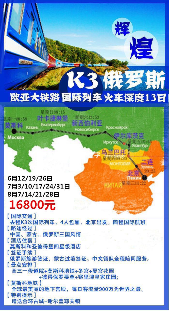 國際列車-俄羅斯經(jīng)典雙城13日游【去程K3次國際列車/回程飛機(jī) 交通工具:【國際列車】:北京-莫斯科,K3次國際列車(4人硬臥/2人高級包廂) 【境外火車】... |