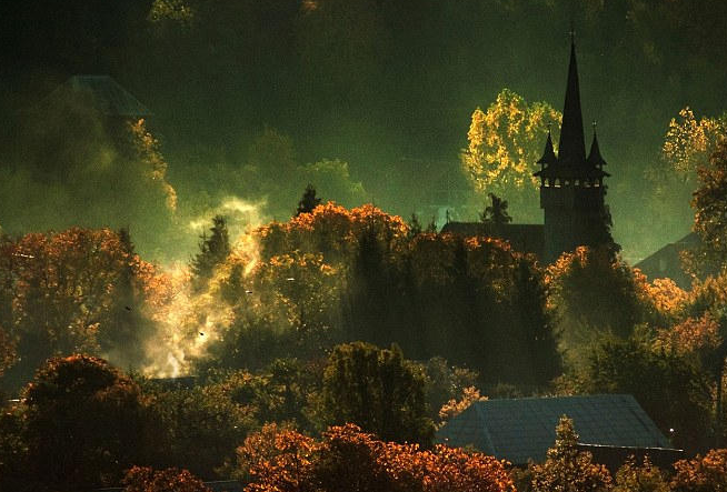 清晨迷霧之中的森林將教堂輪廓襯托的愈發(fā)明晰,好似吸血鬼故事中的場(chǎng)景一般。