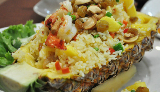 泰式菠蘿炒飯:泰式菠蘿炒飯運(yùn)用泰國香米的香氣,搭配菠蘿以及什錦蔬菜等大火快炒,咸咸酸酸甜甜的口感,才吃一口就會(huì)讓人食欲大開,撘配腰果一起入口,口感層次豐富,相當(dāng)值得推薦!尤其把飯裝在菠蘿里一起上桌,視覺效果奇佳!