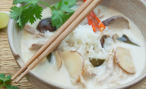 泰式椰汁雞湯:泰式椰汁雞湯是曼谷名湯,已有數(shù)百年的歷史。因?yàn)橐處鹞?,比較膩滯,所以一般泰國菜中,椰奶多用作咖喱菜肴之調(diào)味或調(diào)色,極少作烹湯用。但此菜利用椰奶代水煮湯,別具一格。湯中放如南姜,香茅,芫荽,朝天椒,魚露,青檸檬汁,砂糖。湯煮沸后,再放入雞塊和已撕碎的檸檬葉,煮沸后倒入椰奶,加入調(diào)味料及朝天椒,略滾即可。