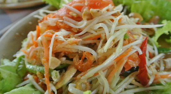 青木瓜沙拉:據(jù)北京旅行社了解,青木瓜沙拉是泰國人很喜歡的一道開胃小菜,入口酸、甜,隨后以辣椒帶出青木瓜的鮮脆口感,搭配生菜與花生顆粒的嚼感,讓人一吃就胃口大開。不過點(diǎn)這道菜時(shí)要記得,由于傳統(tǒng)的作法都會(huì)加上魚露、蝦醬與蒜頭,因此在點(diǎn)菜時(shí)只要特別注明這些東西不吃就行了。雖然少了蝦醬與魚露的調(diào)味,以辣椒取而代之的嗆辣口感,卻也讓清淡的開胃菜點(diǎn)綴出鮮活的靈魂。