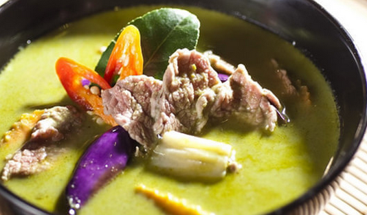 綠咖哩:又稱青咖喱,是泰國咖喱中較辣的一種。主要成分包括椰奶、綠咖哩醬、茄子、魚露、青檸檬等??梢院透鞣N肉類搭配做菜,比如綠咖喱牛肉、綠咖喱椰子雞。也可以與面條和飯互相搭配。