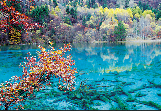 首先最著名的就是五花海,這里真的是九寨溝景點(diǎn)中的一絕也可以說(shuō)是九寨溝的精華,所以大家一定不能錯(cuò)過(guò)。這里清澈多彩的湖面下顯現(xiàn)出一段段的樹(shù)木軀干。湖面整體呈綠松色,不同區(qū)域,顏色變換從黃色到綠色,又到藍(lán)色,展現(xiàn)出湖水五彩的美艷。四周的山坡,入秋后便籠罩在一片絢麗的秋色中,色彩豐富,姿態(tài)萬(wàn)千,獨(dú)霸九寨。五花海的彩葉大半集中在出水口附近的湖畔,一株株彩葉交織成錦,如火焰流金。