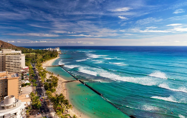 二、威基基海:威基基海灘東起鉆石山下的卡皮歐尼拉公園(Kapiolani Park),西至阿拉威(Ala Wai)游艇碼頭,長達1英里(大約1.6千米),每天到這里的游客不計其數。海灘區(qū)有細致潔白的沙灘、搖曳多姿的椰子樹和寧靜開闊的水域,是一家老小假日休閑的理想地點。除了沙灘,威基基還有很多的有趣景點可供參觀,包括威基基水族館(Waikiki Aquarium)和檀香山動物園(Honolulu Zoo)。日落時分,還可以在威基基海灘步行街以及度假村內用餐、購物、跳舞、觀看現場表演。