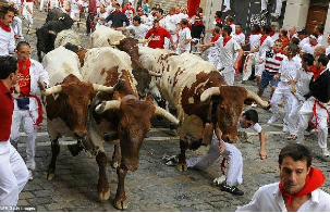 西班牙斗牛:西班牙奔牛節(jié),從每年的7月6日開始舉行,7月14日結(jié)束。地點(diǎn)在西班牙東北部潘普洛納城。在節(jié)日的9天里,來自世各地的人們穿上白衣褲,,纏上紅腰帶,表示參加的意愿。將6條經(jīng)過兩年專門馴養(yǎng)的公牛,突然從牛棚中放出,跟在一大群小伙子后面,狂奔亂竄,穿城而過。這些牛非常兇悍,有的牛角被磨尖,甚至露出神經(jīng),一觸即痛,有的牛眼睛被抹上辣椒,以激怒它,引發(fā)它的野性。