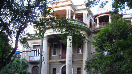 從內(nèi)部看卻是個(gè)條木拼成的八邊形藻井,從二樓直達(dá)井頂,井壁上畫(huà)有中國(guó)花鳥(niǎo)畫(huà)。這“亭子”純屬裝飾。門(mén)、窗、廊、廳的楣上均飾掛水泥透雕飛罩,所有檐角均裝飾纏枝花卉或吸水蚊龍,挑粱雀替均塑龍鳳掛落,把別墅點(diǎn)綴得十分民族化。