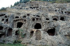 看完了西山石窟群,我們過漫水橋來到了東山石窟。在東山腳下的公路未開通以前,巨石上方原是一片平臺。傳說當年奉先寺竣工時,武則天親自率百官駕臨龍門,主持這次規(guī)模盛大的開光儀式,龐大的樂隊便在這平臺上擂鼓助興,于是后人便把這里叫做擂鼓臺。相臨擂鼓臺的三個洞叫擂鼓臺三洞。